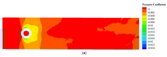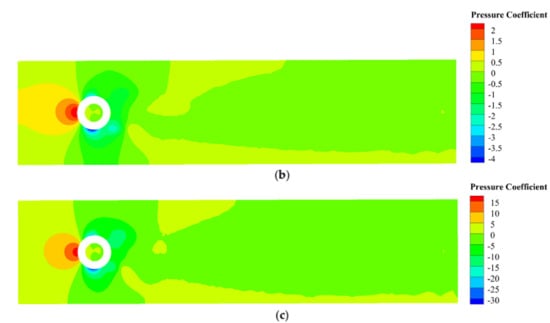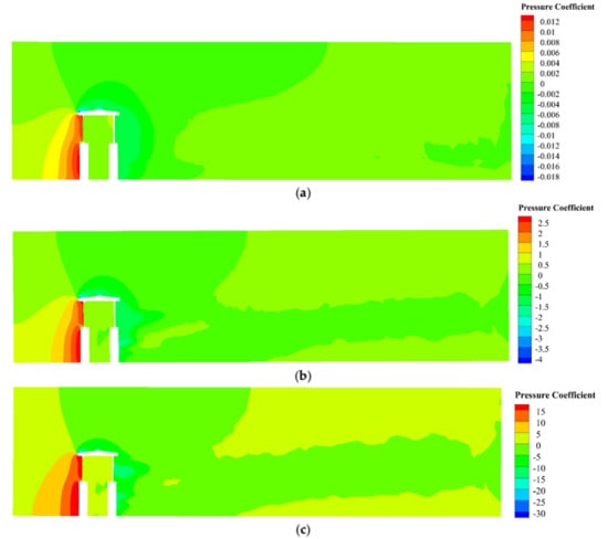Distribution of pressure coefficient in xy-plane for different inlet wind velocities: (a) 0.1 m/s; (b) 1.5 m/s; and (c) 4 m/s.