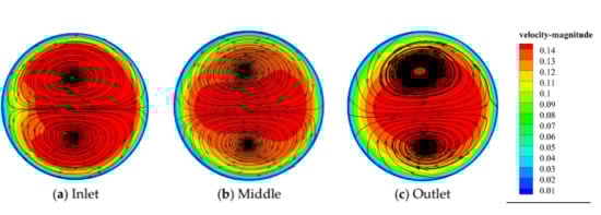 Figure 19 demonstrates the velocity distribution and streamlines at the inlet, middle, and outlet of the wind tower’s column for three wind velocities. The airflow at the inlet of wind tower’s column is clearly divided into two rotational streams, such that at the wind velocity of 0.1 m/s these rotational streams are almost symmetric. Additionally, the velocity distribution within the wind tower’s column for a wind velocity of 0.1 m/s is approximately symmetric but non-uniform (Figure 19a–c). At high wind velocities, there are two rotational streams inside the wind tower’s column, but they are not symmetric, nor are the velocity distributions uniform. For instance, at a wind velocity of 4 m/s, the pattern and quantity of the airflow at the inlet, middle, and outlet of the wind tower’s column are different, and as a result, the configuration of the evaporative cooling pads plays an important role on the pattern and quantity of the airflow inside the wind tower.