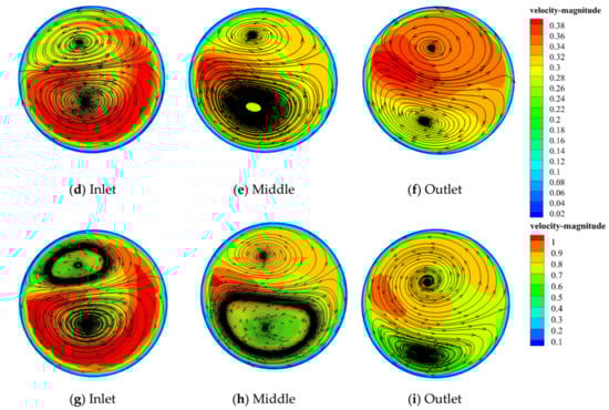 Distribution of velocity and streamlines in different planes within. wind tower’s column for: (a–c) 0.1 m/s; (d–f) 1.5 m/s; and (g–i) 4 m/s.