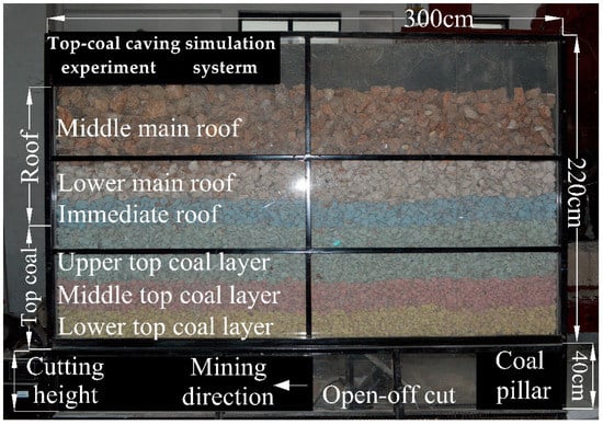 Theoretical analysis and field measurements show that the fragment dimension of top-coal is decreased along the thickness direction [21,23,32], so different colors and sizes of stones were selected to simulate each layer of coal and rock. Clay was added to simulate coal/rock powder with a smaller particle size. In the model, the top-coal seam of Panel 8103 was divided and simulated by the upper, middle and lower layers along vertical direction. The immediate and main roof were simulated by granular material in different sizes. The thicknesses and fragment dimensions of different layers in the simulation experiment model are shown in Table 1 and Figure 1.