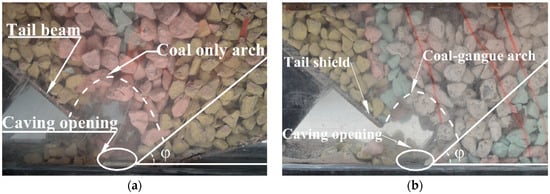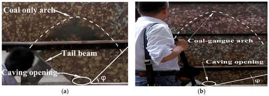 - Middle arch. The middle arch is located at the middle of the flow space (behind the shield beam in horizontal). The span of the middle arch is usually longer than that of the lower arch. The middle arch can be formed by coal blocks only (as shown in Figure 3a) or coal and gangue blocks (as shown in Figure 3b). The front skewback of the arch is generally located on the shield beam or tail beam of the support, the rear skewback of the arch is located on the gangue of gob.