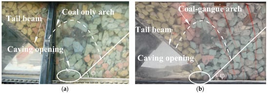 - Lower arch. The lower arch is located at the bottom of the flow space near the caving-outlet with a small span, big arching probability and high stability. That’s because the flow space decreases along the vertical direction. The smaller the flow space is, the larger arching probability would be. The lower arch can be formed by coal blocks only (as shown in Figure 2a), or coal and gangue blocks (as shown in Figure 2b). The front skewback of the arch is generally located at the tail beam of the support, while the rear skewback of the arch is located on the gangue of gob.