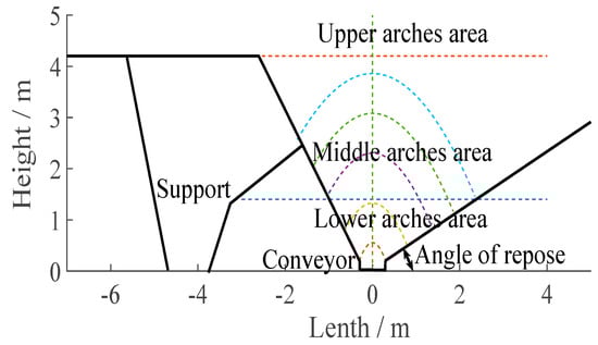 According to the arching position and characteristics, the flow space of the arch structure formed can be divided into the lower arch area, middle arch area and upper arch area. The formation probability, arching medium, arch span size, stability and their impact on top-coal caving flow, and recovery of different arches are also different. The different arch areas are shown in Figure 5.