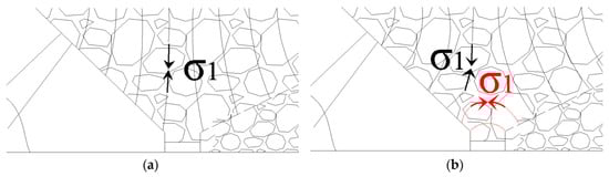 In a stationary state, the trajectories of the major principal stress of the loose coal and gangue behind the support are almost perpendicular and bends slightly toward both sides, as shown in Figure 6a. When the caving-outlet is opened, the static loose coal and gangue loses the support force, and the coal and gangue near the caving-outlet begins to flow and discharge out. The shape and size of broken coal/gangue are irregular and uneven, causing large friction between particles. During the discharge phase, the flow of the coal gangue is blocked, so the movement of the coal and gangue in higher position will lag than lower ones. In addition, the coal caving space is gradually shrinking from top to bottom, the trajectories of the major principal stress of coal/gangue near the coal-caving port will become horizontal, while the one of the coal/gangue in the higher position is gradually reduced, but still vertical, as shown in Figure 6b.
