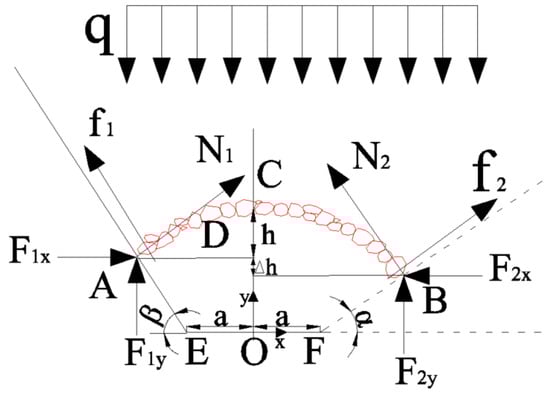 The arch is considered as a whole, and the front skewback on the tail is recorded as A, the angle between the tail beam and the horizontal plane is β, the vertex of the angle is set to E, the rear skewback on the gangue in the Gob is recorded as B, the resting angle of the gangue is α, the vertex of the rest angle is F, the uniform pressure from coal gangue above the arch is q, the skewback is supported and the frictional force respectively, The support force is decomposed into two forces in horizontal and vertical directions, and the force analysis is shown in Figure 8.