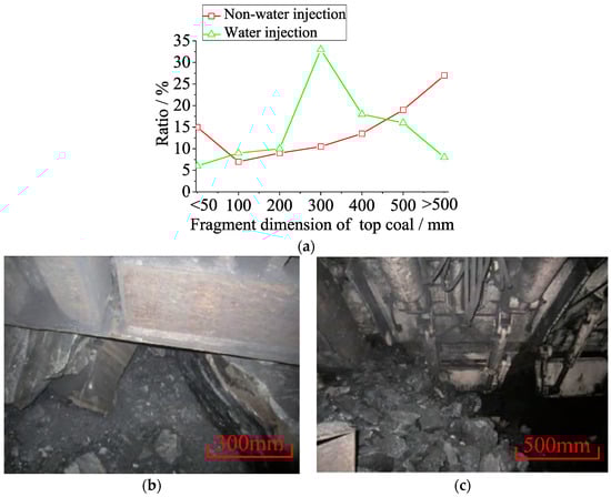 Dynamic pressure combined with static pressure water injection was used in long boreholes to softening the top-coal of the Panel 8103, that is, the boreholes were bored in both gateways in opposite directions along the coal seam. The water injection boreholes move with the recovery schedule and keep a 30 m distance from the working face. Fragment dimension of the top-coal in non-water injection and water injection zone were observed, and the observation result as shown in Figure 10a, the fragment dimension as shown in Figure 10b,c.