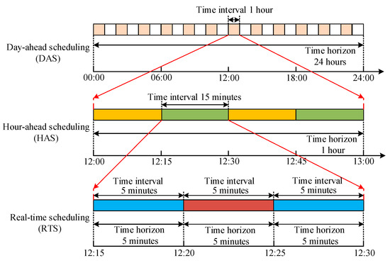 The forecast accuracy of the output power of RES can increase with the reduction of prediction length. Meanwhile, the output power of RES usually fluctuates severely within an hour. In this context, the DAS with one-hour interval fails to utilize the intra-day forecast power of RES with higher precision, and cannot capture such fluctuation characteristics. In addition, the DAS cannot explore the multi-timescale characteristics of the BES and DR. Therefore, a hierarchical energy management framework is put forward. The framework comprises three stages of scheduling: DAS, HAS, and RTS. The relation among such scheduling is shown in Figure 1.