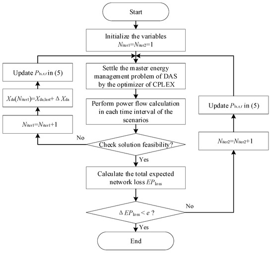 The iterative solution is the core of the decomposition-based algorithm. Taking the DAS as an example, the flowchart of the iterative solution is depicted in Figure 2. Notice that, Niter1 and Niter2 are both the counters of the algorithm.