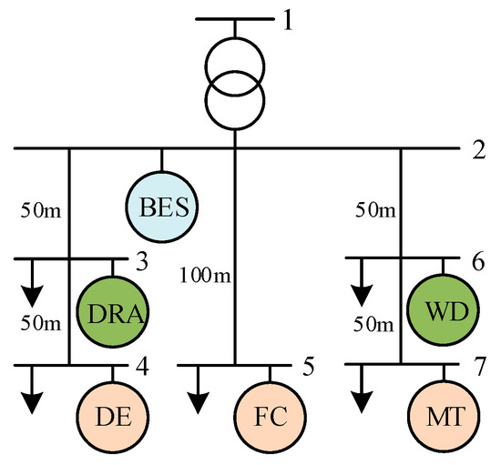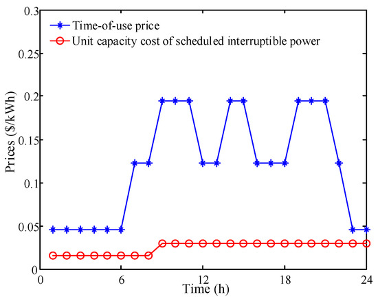 An MG system is shown in Figure 3, whose network parameters can be obtained from [12]. The MG consists of a DE, an MT, an FC, a wind turbine, a BES, and a DRA. The technical and economic parameters of CDG and RES are summarized in Table 1. For BES, its rated power and capacity are 50 kW and 200 kWh, respectively. The charging efficiency and discharging efficiency are both set to 0.922. The maximum allowable SOC, initial SOC, minimum allowable SOC, and the SOC limit at the end of the day are set as 1, 0.5, 0.2, and 0.5, respectively. The unit OMC is 0.008 $/kWh. For DRA, the upper and lower limits of scheduled interruptible power are chosen as 80 kW and 30 kW, respectively. The response time limit is set as 12 h. The time set of allowing the interruptible power to be scheduled is [7:00, 22:00]. Furthermore, the maximum exchanged power with the main grid is 500 kW. The time-of-use price of a province in China is depicted in Figure 4. Referring to [25], the unit capacity cost of scheduled interruptible power for DRA is also depicted in Figure 4. To follow the operation results of DAS, it is assumed that the penalty cost is 1.5 times the time-of-use price. Also, the unit energy cost of the interruptible power deployed in DAS, HAS, and RTS are assumed to be five times, eight times, and 10 times the unit capacity cost of the scheduled interruptible power.