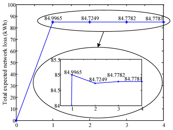 - When there exists a violation of security constraints, a tiny random vector ΔXda will be added to the last feasible solution Xda,last to calculate the power losses again. Then, the master problem will be rerun using the updated power balance constraints (5). [2]. If there is no violation of the constraints, the power loss will be calculated in each time interval of the scenarios, and the total expected network loss EPloss would be decided. The newly calculated power losses will be returned to the master problem for updating the power balance constraints (5), until the variation of the total expected network loss ΔEPloss is less than the tolerance limit e.