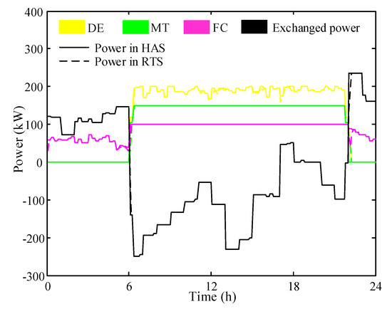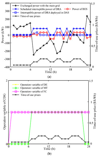 The DAS is conducted every 24 h with the temporal resolution of 1 h. The operation status of CDG, the charging and discharging power of BES, the exchanged power with the upstream grid, the scheduled interruptible power of DRA, together with the interruptible power deployed in DAS of DRA can be determined. Such variables will be taken as the input parameters of the HAS. The HAS is performed every hour with 15-min intervals. In this phase, the power of CDG and the interruptible power deployed in HAS of DRA can be decided. Meanwhile, the charging and discharging power of BES and the exchanged power with the upstream grid would be adjusted according to the forecast data of RES and the load within the next hour. The RTS is executed every 5 min for eliminating the imbalanced power because of the fluctuations of RES and load, by adjusting the operation of CDG and BES together with the exchanged power with the upstream grid. Additionally, the interruptible power deployed in RTS can also be used to realize the power balance.