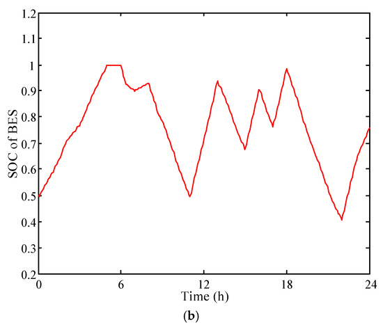 For each BES, the discharging and charging power are limited by the corresponding maximum and minimum limits in (13) and (14), respectively. Constraint (15) indicates that the charging and the discharging status of BES are mutually exclusive. The variation characteristics of the state of charge (SOC) of BES are defined in (16). Constraint (17) requires the SOC to be within the permissible range. In order not to affect BES operation in the next day, the SOC of BES at the end of the day is forced to be not less than a specific SOC limit in (18).