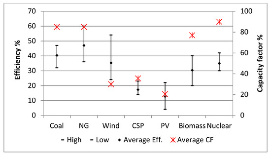 Efficiency is the most used technical indicator to evaluate energy systems [12]. According to several previous studies (see [15,40,41,42,43,44,45,46]), Figure 1 shows the value range and average value of the efficiencies of electricity generation of the technologies under assessment. It can be observed that natural gas-fired power plants occupy the top efficient technology with an average value of 47%, whereas PV has the lowest efficiency of around 13% with a possible maximum of 22%. However, the German Frauenhofer Institute of Solar Energy Systems and the French Soitec Institute have developed certain types of PV panels that are very expensive to use commercially but can reach an efficiency of 46% [47].