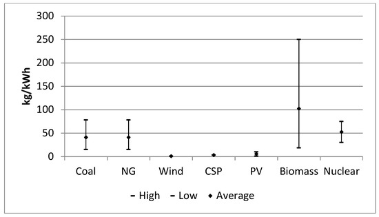 The price of electricity offered by the power generation system includes all the costs over the lifetime of the systems: initial investment, operation and maintenance, fuel cost, and cost of capital [58]. It is also influenced by the typical characteristics of the technology, such as efficiency, annual production, service life, and the nature of the energy source utilized. In Figure 4, the average cost of electricity generation for coal, NG and nuclear are comparable at a value of around 0.05 USD/kWh, for wind and biomass it is almost doubled, whereas for CSP and PV, it is particularly very high of 4 and 6 times the average values of coal, respectively [15,41,42,43,45,46,48,59]. Surprisingly, we found in the literature [41] a wide value range for PV which again reflects the different designs and technological features.