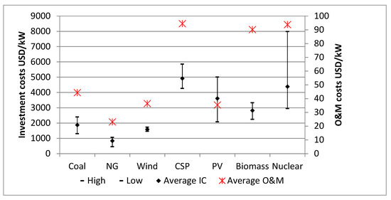 Investment cost includes all costs related to the construction and installation of power plants, purchased equipment, engineering and consultation services and any costs that may arise before the operation of the power plants. It includes neither fuel costs, nor maintenance costs. Nuclear and coal-fired units are characterized by high investment costs and low operating costs while gas-fired generation is characterized by lower capital costs and higher operating costs [12]. Photovoltaics and solar thermal power still suffer very high investment costs that restrain their propagation although they consume free energy resources. Figure 3 shows a comparative analysis of the investment costs of different power technologies. The investment costs range between 1300 and 2400 USD/kW for coal power plants, 450–1060 USD/kW for NG power plants, 1460–1730 USD/kW for wind power plants, 4260–5850 USD/kW for CSP plants, 2080–5000 USD/kW for PV, 2240–3330 USD/kW for biomass power plants and 2950–7980 USD/kW for nuclear power plants [46,48,56,57]. Still CSP represents the most expensive technology however it shows a comparable average value as that of nuclear. NG shows the cheapest power plants which justifies their preferences by most of the investors. Interestingly the average investment costs of wind power plants are cheaper than that of coal by about 300 USD/kW which is a significant value.