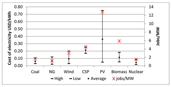 Job creation represents economic and social dimensions of sustainable development. As jobs are created by the energy system, they improve the quality of life of local society [9] and reduce unemployment. Throughout the life cycle of the power plants, many people are employed either in direct jobs like in manufacturing, installation, operation and maintenance or in indirect jobs like the suppliers of equipment, construction and installation materials [12]. A study was done by the World Bank assessing the potential of local manufacturing of concentrated solar power plants in Egypt. The study revealed that Egypt’s key strengths on production factors are: low cost of labor and of energy for industrial consumers; availability of glass, steel, and stainless steel; and a strong manufacturing capability [60]. Figure 4 shows the potential jobs that could be created for each type of power systems in the construction, installation, manufacturing, O&M and fuel processing sectors [61,62]. Interestingly, PV shows the highest job creation potential with an average value of 13 jobs/MW whereas coal, NG and nuclear are below 2 jobs/MW.