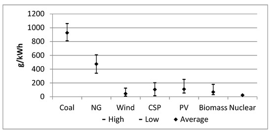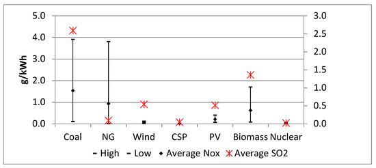 Nitrogen monoxide and nitrogen dioxide (NO and NO2) are emitted from the combustion of biomass and fossil fuels at high temperature. The greenhouse gases contribute to global warming and climate change, and moreover cause local air pollution and acid deposition, may do harm to the health of people, affect agricultural products and cause biological mutation as they form toxic products in reaction with ammonia, moisture, volatile organic compounds, common organic chemicals, and even ozone [9,12]. According to a literature review, Figure 6 gives evidence of the contribution of biomass and fossil combustion to a great extent in the emission of NOx gases, where it could reach almost 4 g/kWh for coal and NG and more than 1.5 g/kWh for biomass. However, the other technologies show an emission of lower than 0.5 g/kWh.