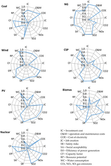 The first formula is used when the indicator represents a value, whereas the second formula is used when the indicator represents a cost, so that ultimately, we get a value between 0 and 1 for each criterion across the assessed technologies with an equal interpretation (i.e., 1 means the best). A comparison of the normalized multi-criteria evaluation of the technologies under assessment is shown in Figure 7.