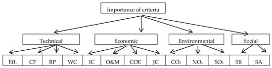 The analytical hierarchy process (AHP) was proposed primarily by Saaty [72] and is based on the decomposition of a complex problem into a hierarchy with an objective at the top of the hierarchy, indicators and sub-indicators at levels and sub-levels of the hierarchy, and decision alternatives at the bottom of the hierarchy as shown in Figure 8. Here, we evaluate the weight of the indicators in a pair-wise comparison using the scoring system presented in Table 6 with an objective of their importance regarding energy technology selection according to the perspectives of participants in the questionnaire we designed.