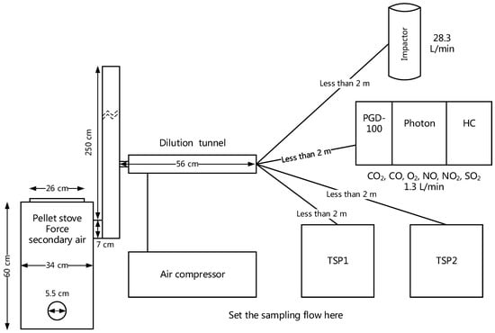The emissions of the stoves were measured using an Emission Monitoring System (see Figure 2). The stove + pot in China was a sealed system in which the emissions from the stove can only go into the chimney and release outside the room (with leakage not being considered). A sample of the gas was drawn into a dilution tunnel which was mixed and diluted with particle-free air from an air compressor. At the end of the dilution tunnel, the well-mixed diluted gas went into a gas analyzer for CO and CO2 by non-dispersive infra-red (NDIR) sensors. Total suspended particulate (TSP) collectors collected all the particle matters (PMs) using quartz filters. Additionally, PM size distribution measurements were taken using an eight-grade impactor with quartz filters. All sensors were calibrated prior to conducting measurements. Filters were conditioned in a humidity controlled environment for 24 h, and then weighed at 25 °C and 50% relative humidity. The dilution level of the sample was calculated using the formula below.