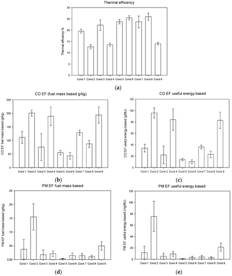 The differences of fuel mass-based (g/kg) and useful energy-based (g/MJ) emission factors were also analyzed in this paper. Based on the resolution and accuracy of the instruments, the thermal efficiency and CO EFs were reported to one decimal place (by g/kg or g/MJ), and the PM EFs were reported with three decimals (by g/kg or mg/MJ).