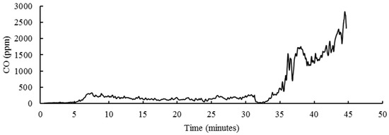 It was important to note that, with this testing sequence, the CO EFs (whether useful energy-based or fuel mass-based) were much higher than the test results reported by WBT version 4.2.3 [5]. The CO EF of this test was within 50–200 g/kg and was comparable with Shen et al. [29], who used raw corn straw on the Chinese stove. Sevault et al. even showed 174.2–269.7 g/kg for wood stove using charcoal [30]. On the other hand, the number of CO EFs using WBT version 4.2.3 were usually in the range of 10–50 g/kg [8,23,31]. This was because the Chinese testing sequence included a burnout phase at the end of the test when the remaining fuel was mainly charcoal [32]. Hot charcoal burning usually needed more air and a better air-fuel mix. The absence of this condition would result in a high level of CO (see Figure 4). The WBT version 4.2.3 ended when the water temperature reached boiling point, when the fuel was still burning and did not reach the burnout phase. It was suggested to include the burnout phase in all tests. This was because, even though the user may have already finished the cooking task, the stove was still placed in the room. With ash not being removed, the emissions of the stove still go into the room (or outside if the stove had a chimney). Although most of the Chinese semi-gasifier stoves were equipped with chimneys to lower the indoor emissions, they still contribute to the outdoor air pollution.