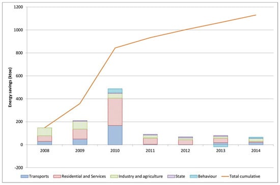 In 2017, the Portuguese Government presented the third NEEAP that describes the measures to be adopted until 2020, and also the savings expected and obtained for the period from 2008 to 2015 [9]. The impacts of the measures implemented in each area, between 2008 and 2014, as well as the cumulative impact value, are presented in Figure 1. According to the third NEEAP, the slowdown in the economy during the “economic adjustment” period may justify the reduced adoption of energy efficiency measures in the years between 2011 and 2014.