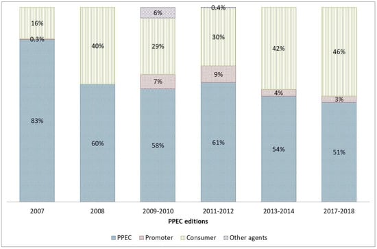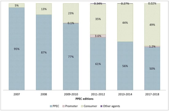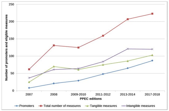 Generally speaking, the participation in PPEC editions has been increasing from one edition to the following one. The number of promoters has been steadily increasing from eight in the first PPEC edition to 87 in the last one (Figure 2). In addition, the number of measures that have been submitted and considered eligible has been increasing. The number of eligible measures rose, from 62 in 2007 to 223 in the last edition, representing an increase of more than three times. The increase was sharper from 2007 to 2008, and there was a slight decrease from 2008 to 2009. This decrease was mostly due to a decrease in the number of tangible measures and a reduction in the pace of increase of intangible measures. The 2008 PPEC rules [18] came into force in the 2009–2010 edition. This change in the rules could also have influenced the reduction of the number of eligible measures.