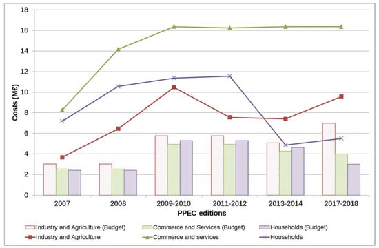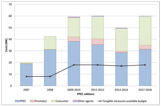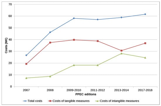 The PA costs of the eligible measures increased sharply in the first three editions and remained without significant variations since then (Figure 3). In the last four editions, the difference between the highest (61.6 M€ in 2017–2018) and the lowest (57 M€, in 2011–2012) is around of 4.5 M€, 8% of the lowest value. The main variations were an increase in the cost of intangible measures and a decrease in tangible ones, in the same PPEC edition (the 2013–2014 edition). These variations were probably due to the transfer of one million Euros from the tangible measures budget to intangible measures (Table 3).