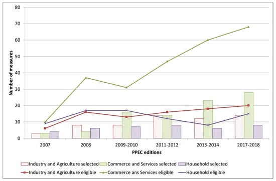 Number of eligible and selected measures by consumer segment in each PPEC edition [19,20,21,22,23,24,25,26].