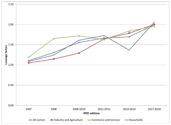 In the first PPEC edition, total investment in tangible measures was 9.2 M€, being 8.3 M€ from the PPEC budget. In the last PPEC edition, the total expected investment is 35.9 M€, the participation of the PA reaching 18 M€. The expected investment increased 3.9 times, from 9.2 M€ in 2007 to 35.9 M€, in the last PPEC edition, while the PA costs increased only 2.2 times. The existence of a leverage factor [27] is clear. A leverage factor of 1.0 means that all the investment is made from program funds. A leverage factor of 2.0 means that only half the investment is made from program funds. Figure 12 shows the leverage factors for all selected tangible measures (all segments) and for each segment individually, in each PPEC edition. As can be seen, the leverage factors were, in the last PPEC edition, near 2.0 (1.99), meaning that, for each euro invested from the program funds, an additional ninety-nine cents were invested. In the first PPEC edition, the leverage factor was 1.11. In the Households sector, it is expected that 1.06 € will be invested for each euro from PPEC funds, since its leverage factor is 2.06. The lowest leverage factor, of 1.95, occurred in the Commerce and Services sector. Nevertheless, it is very close to the leverage factors found in the other consumer segments. The lowest value for the leverage factor found for the Households segment, in the 2013–2014 edition, is mostly due to that same measure, identified earlier, with the PA costs being 78% of the societal costs.