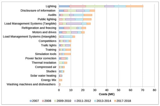 Costs of the measures by targeted energy services, for each PPEC edition [19,20,21,22,23,24,25].