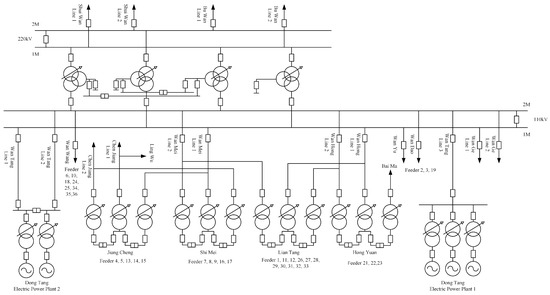 Primary electrical system in Wanjiang area above 110 kv, including electric power plants, transmission buses, converting stations, and user loads. The feeders are marked under their corresponding load sides.