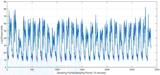 The real-world load data of individual customers in Wanjiang area is recorded from Dongguan Power Supply Bureau of China Southern Power Grid in Guangdong Province, China during 2012–2014. The topology structure of Wanjiang area is shown in Figure 3. There are 36 feeders connecting to the load sides in the Wanjiang area, i.e., Feeders 1—36. The active power is extracted for load forecasting from these feeders. The sampling period is 15 min as the meter record data. The load curve of a customer, No. 53990001, from Feeder 2 during a month is shown in Figure 4, where the different load characteristics of the customer on each day can be concluded.