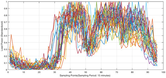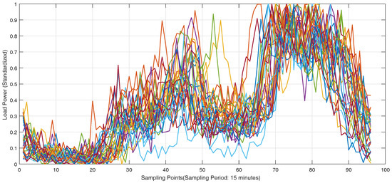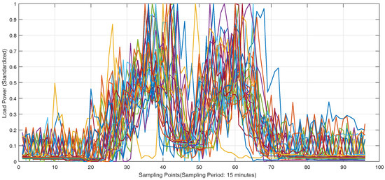Before the short-term load forecasting using GRU neural networks, the load curves of individual customers are clustered to different categories for samples with K-means clustering algorithm. The parameter K is selected as 3 by Elbow method. There are 746 customers in the Wanjiang area in Dongguan city. The load measurement data should be processed with 0–1 standardization to the same scale for clustering to reduce the impact of different magnitudes and dimensions. The clustering is done for 10 times with load curves in 10 days for the individual customers. The clustering results are obtained with the average results in 10 days and the number of each clustering category is shown in Table 4. The standardized curves for 30 selected customers in three categories on a weekday are shown in Figure 6, Figure 7 and Figure 8.
