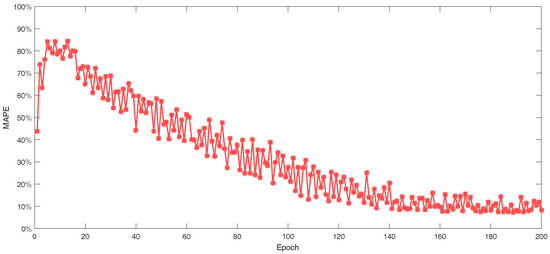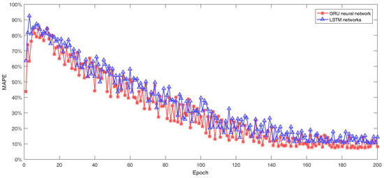 The performances are good with LSTM networks in dealing with time sequence but there are more parameters to train compared with GRU neural networks. In the proposed network, the GRU layers have 285,300 parameters to train while the LSTM layers have 380,400 parameters with the same architecture. The cost time for training with LSTM network is about 20% longer than training with GRU neural networks in the experiments in this paper. The MAPEs of network with LSTM and GRU layer in the same architecture with the same samples in Category 2 during the training process are shown in Figure 14. We can conclude that GRU neural networks do better in both convergence speed and training time, which depends on the improved single structure of GRU units.
