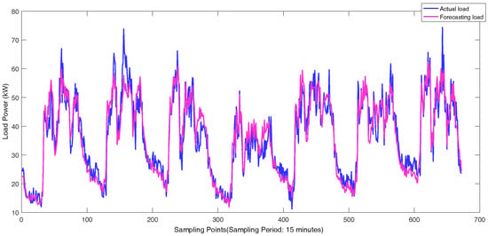 Customer 53990001 is selected from Category 2 for the forecasting customer. The MAPEs during a training period for Category 2 are shown in Figure 9 when the parameters are set as shown in Table 6. The compared curves of actual load and forecasting load using the proposed method on 18 November for Customer 53990001 are shown in Figure 10. The MAPE for Customer 53990001 on 18 November is 10.23%. The compared curves of actual load and forecasting load from 18 to 24 November for Customer 53990001 are shown in Figure 11. The MAPE for Customer 53990001 in this week is 10.97%. In Figure 10 and Figure 11, the error in sample points of one day is basically average and becomes larger when the curve comes to a peak. It is reasonable because the high or low peak is not reachable in most cases. The network should balance the prediction results for most situations during the training process. According to Figure 9, the MAPE decreases to a steady state as the epoch increases to 200. According to Figure 10 and Figure 11, the forecasting curve is close to the actual curve, which proves the availability of the proposed method.