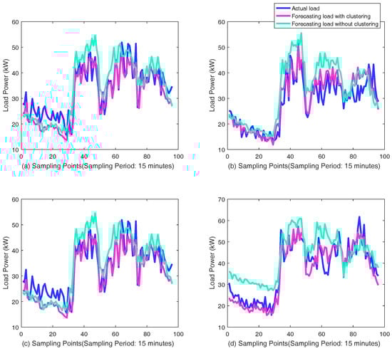Compared curves of actual load and forecasting load of Customer 53990001 with or without clustering: (a–d) the results for four different days in November 2013.