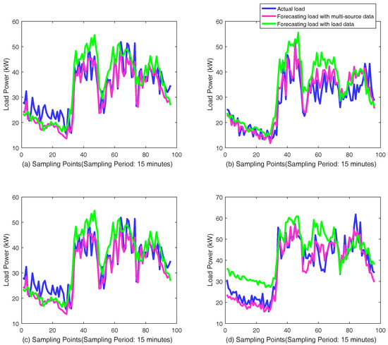 Comparison curve of actual load and forecasting load of Customer 53990001 with or without multi-source data: (a–d) the results for the same four days in November 2013 as the experiment in Figure 12.