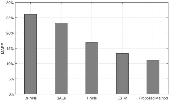 We also performed the experiments to compare with current methods such as back-propagation neural networks (BPNNs) [7,8], stacked autoencoders (SAEs) [17], RNNs [24,25], and LSTM [29,30,31]. Their parameters and structures are set as described in Section 3.2. The compared average MAPEs of these methods, trained and tested with all samples described at the beginning of this subsection, are shown in Figure 15. The specific values of average and maximal MAPEs are shown in Table 10. Moreover, the results of nine customers are shown to validate the better performance of the proposed methods. The MAPEs for 30 November 2013 are shown in Table 11. It can be concluded that the proposed method results in smaller error in both average and maximal MAPEs. The proposed method performs better compared to the other current methods in most cases for short-term load forecasting in Wanjiang area.
