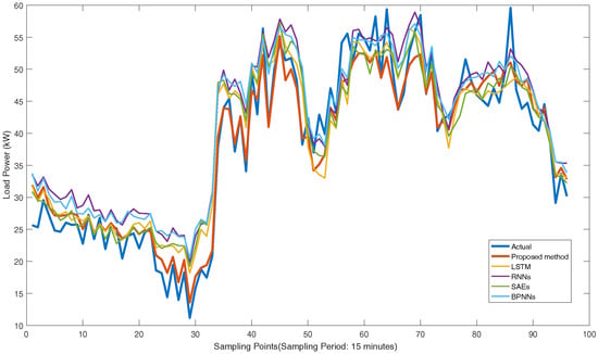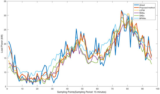 In detail, the forecasting load curves of Customers 37148000 and 53990001 on 30 November 2013 based on these methods are shown in Figure 16 and Figure 17. We can observe the closest curve to the actual curve is the proposed method in the results of these experiments. Time information is important in short-term load forecasting which the BPNNs and SAEs cannot extract. Therefore, they get poorer performance in the experiments. The vanishing gradient problem limits the performance of RNNs because of the decreasing perception of nodes. The architecture is simpler and the parameters are fewer in GRU neural network compared to LSTM networks (Section 2.1). Therefore, the performances of GRU neural networks are better than the other current methods. In general, the availability and improvement of the proposed method are proven by the real-world experiments.