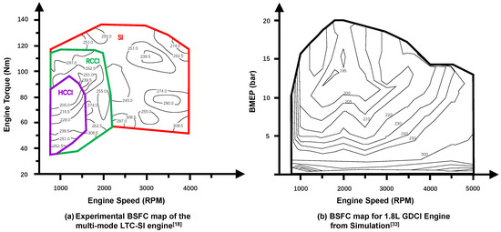 In addition to conventional spark ignition (SI), low temperature combustion (LTC) is promising to improve the fuel economy, especially for the HEVs, where the powertrain electrification can offer extra power to drive the vehicle and decouple the engine and the vehicle, facilitating the engine to work in a high-efficiency area. A great amount of work has been done to explore the LTC engines from various aspects. In [12,13], a homogeneous charge compression ignition (HCCI) engine was utilized in a series HEV, and three kinds of energy management controls (EMC) were designed to investigate their influence on the fuel economy of series HEVs. In [14], a dual-fuel, reactivity controlled compression ignition (RCCI) engine was used in a series HEV to estimate the influence on fuel economy and emissions performance. Solouk, A. et al. applied a HCCI/RCCI/SI multi-mode engine in a series extended range electric vehicle, and the results under city driving cycle showed that the multi-mode engine had a better fuel economy compared with the engines which had only one combustion mode [15]. Similarly, for a mild HEV, a multimode engine (SI/HCCI) was also applied by Nuesch, S. et al. [16]. In addition, the HCCI/RCCI/SI engines were integrated with parallel hybrid electric configurations in [17,18] to select the optimal electrification level.