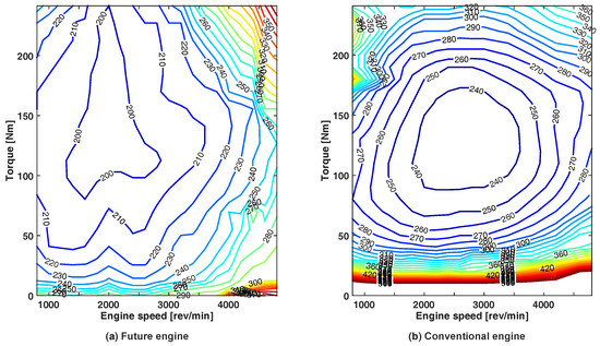 According to the literature and research reviews in the introduction, engine fuel consumption will continue to decrease with future engine designs as engineering and technologies progress [34]. Therefore, inspired by the previous research in literature [18,33], in addition to the consideration of the transition fuel penalty between different modes mentioned in [35], a hypothetical engine BSFC map is proposed, with the lower BSFC value and extending fuel economy area whereas the operating ranges (speed range and output torque range) are held fixed. The proposed engine BSFC map is shown in Figure 3a, and as a contrast, a conventional engine BSFC map is applied in Figure 3b.