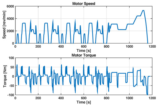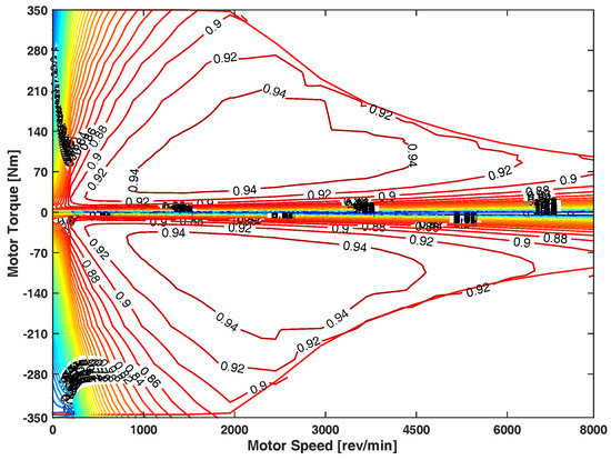 where and are the efficiency of the motor and the generator, respectively, is the power of the motor, and is the power of the generator. The motor efficiency map is shown in Figure 4.