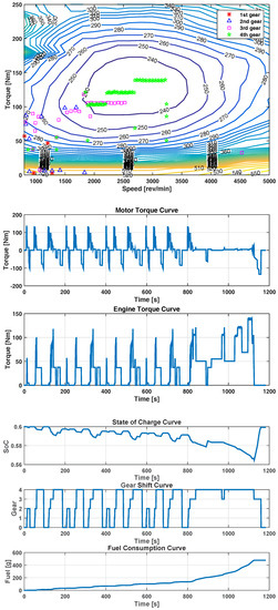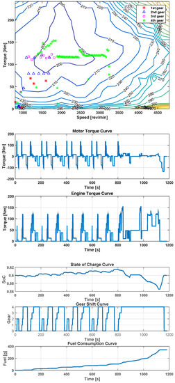 All the simulations are conducted in the MATLAB software (Version R2012b, The MathWorks, Inc., Natick, MA, USA) and a total of 30 simulations are required to run all combinations of two engines, three driving cycles and five groups of different gear ratios. Here, we take four gear numbers as an example to illustrate the simulation results in the NEDC condition. The simulation results are shown in Figure 8 and Figure 9, where Figure 8 represents the simulation results with the conventional engine and Figure 9 represents the results with the future engine.
