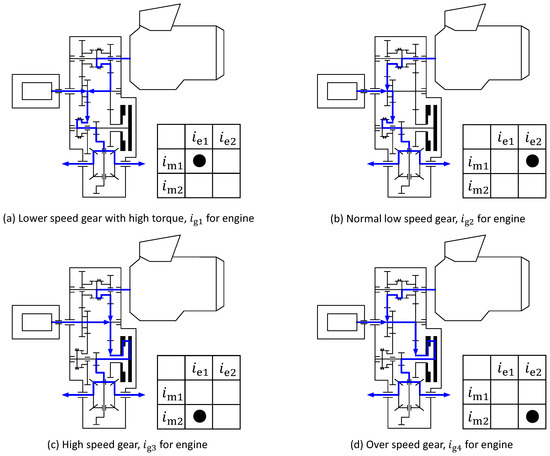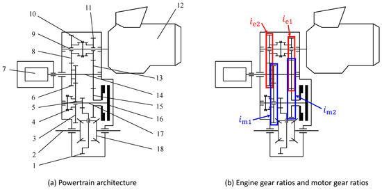 The parallel hybrid electric vehicle has been applied in various research [17,18], and in this paper, a novel parallel HEV powertrain architecture [39] is proposed, as is shown in Figure 11a. Figure 11b shows that the powertrain gear ratio consists of engine gear ratio and motor gear ratio , and can be calculated as : (1) The engine torque is transmitted through the synchronizer 10 located in the engine output shaft. The engine gear ratio is when the synchronizer 10 is locked with the low speed gear, and is when the synchronizer 10 is locked with the high speed gear; (2) The torque on the motor output shaft is either transmitted through the synchronizer 4 or the clutch. The motor gear ratio is when the synchronizer 4 is locked and the clutch is released, conversely, the motor gear ratio is . Thus, this automated manual transmission can provide four gears for the engine operating condition, and two gears for the motor condition, which can fully maximize the engine’s and motor’s capacities. A starter motor is equipped with the engine (which is not shown in the figure), so that the engine can be started when necessary. Besides, the dry clutch is located behind the transmission so as to realize the seamless gear shift process, which is a major problem of conventional AMT. Both the fuel consumption and gear shift quality are analyzed to verify that the transmission with four gears can guarantee the vehicle driving performance.