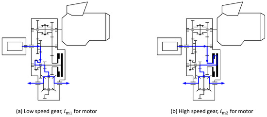 When the vehicle operates in EV mode, only the motor supplies the demand power and the engine is not involved; there are two gears, as shown in Figure 12, which are called low speed gear and high speed gear. In the low speed gear, the motor torque is transmitted to the vehicle through the synchronizer, while through the clutch in the high speed gear.