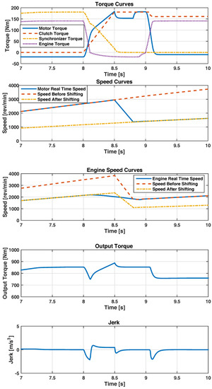The gear upshift processes in the EV mode from Figure 12a,b and in the HEV mode from Figure 13b,c are taken as examples and results are shown in Figure 18 and Figure 19, respectively.