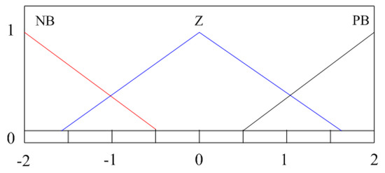 - As the input amount p is the voltage drop depth, three language variables were selected according to the voltage without falling, with slight fall, or with serious fall. The rotor speed range corresponding to the variable speed section of the DFIG is limited, so the language variables of the two inputs are positive big (PB), zero (Z), and negative big (NB), respectively, and the universe of discourse is [−2,2]. There are also three language variables for the output, namely PB, Z, and NB, and the universe of discourse is [−2,2] as well. The detailed relationship between the membership function and the universe of discourse is shown in Figure 6.