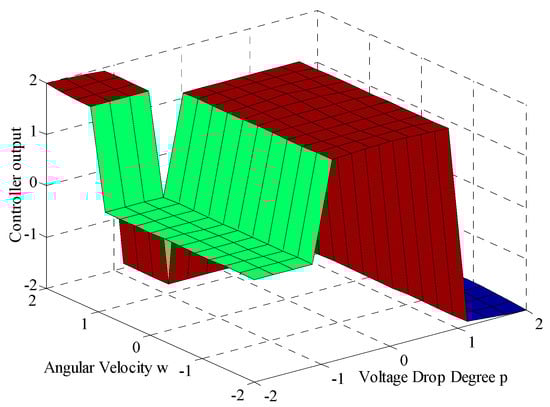 As seen from Figure 7, the output of the fuzzy controller has two inputs, which are the drop depth of the voltage and the rotor speed of the DFIG. Fuzzy control rules are formulated according to the degrees of voltage drop depth and angular velocity change. The two inputs are passed through the fuzzy controller, and the output is high level, low level, or zero level. The corresponding states of the power grid connected to the DFIG are minor fault, serious fault, or no fault. The output signal of the controller controls the bypass switch of the SDBR and the output value of the fuzzy controller is −1, 1, 0, corresponding to larger resistance, smaller resistance, and no action, respectively.